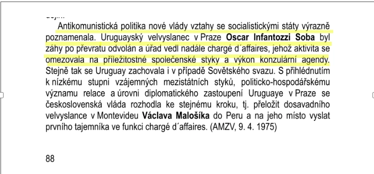 Sin embargo, la explicación “extraoficial” citada encaja perfectamente con lo que sostiene el expediente de la StB dedicado a este infortunado diplomático. Además, los informes de inteligencia de la época (es decir, de 1973 y años posteriores) procedentes de Montevideo confirman que Uruguay, frente a la crisis económica, tenía interés en mantener buenas relaciones comerciales con los países socialistas, principalmente para la exportación de lana y carne.