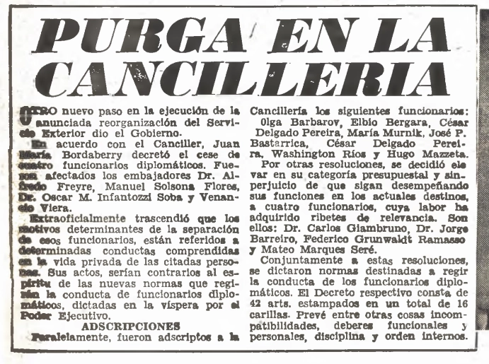 En él se informa que el presidente Juan María Bordaberry, de común acuerdo con el entonces ministro de Relaciones Exteriores, emitió un decreto mediante el cual separó del servicio del Estado a varios diplomáticos y funcionarios, entre ellos Infantozzi Soba. Lo sustancial es el motivo de esta purga, que el artículo explica de la siguiente manera: