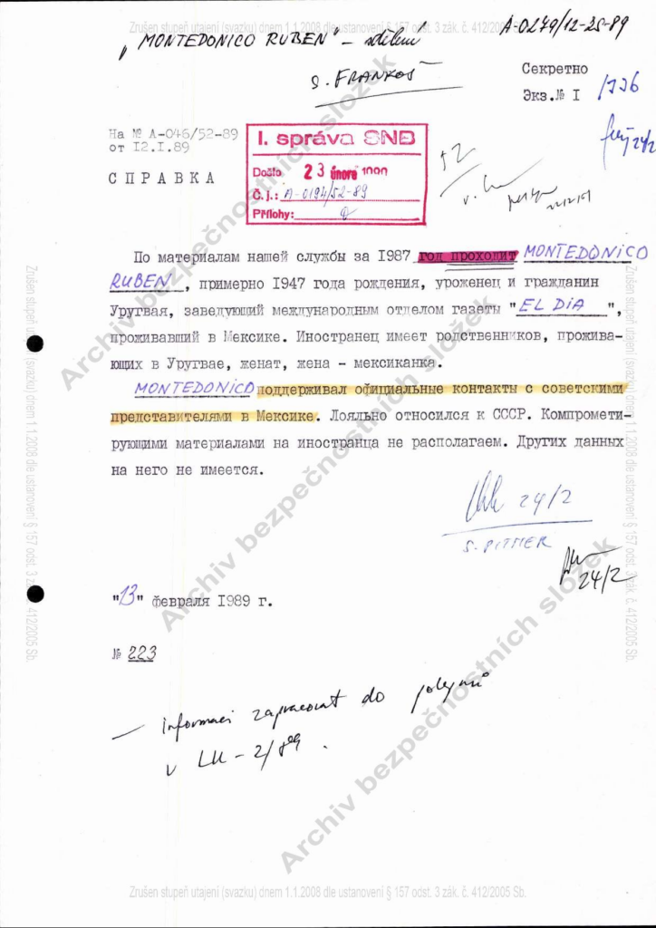 Odpowiedź KGB nadeszła 13 lutego 1989 roku i stwierdza, że Sowieci znają osobę MONTEDONICO RUBEN od 1987 roku, że jest żonaty (jego żona jest Meksykanką), pochodzi z Urugwaju i utrzymywał oficjalne kontakty z ambasadą sowiecką w Meksyku. KGB nie posiadało żadnych materiałów kompromitujących go.